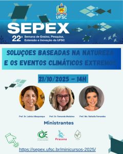 O Observatório de Justiça Ecológica – OJE (UFSC) -, em parceria com o Observatório Jurídico de Soluções baseadas na Natureza – OJSBN (FURG) e o Instituto Piracema – Direitos Fundamentais, Ambiente e Biotecnologias, participa da 22 SEPEX com a oferta do Minicurso Soluções baseadas na Natureza e os Eventos Climáticos Extremos. A atividade reforça as parcerias institucionais e participação efetiva dos alunos da pós-graduação e da graduação da UFSC.